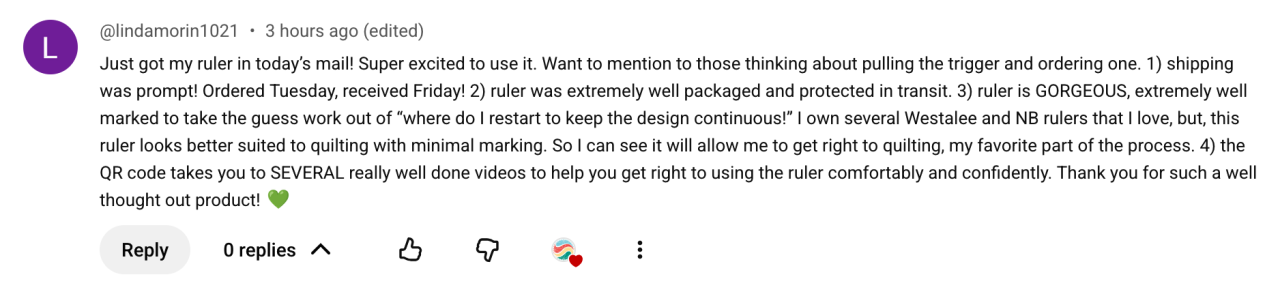 We ship via USPS Ground Advantage with tracking. Should your package be lost or arrive damaged, contact us. If damaged send photos of box and damaged ruler to info@livingwaterquilter.com.